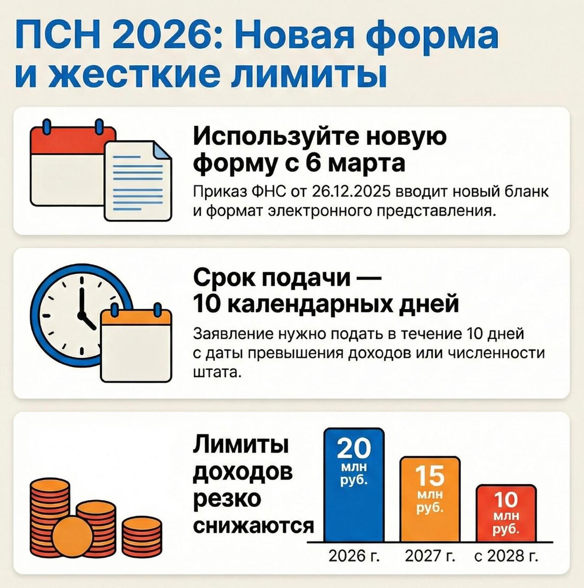Коллеги, еще одно важное обновление для ИП на патенте! С 6 марта 2026 года вступает в силу новая форма заявления об утрате права на ПСН (Приказ ФНС № ЕД-7-3/1275@ от 26.12.2025). 📉 Почему обновили форму? Главная причина — поэтапное снижение лимита доходов для ПСН: 2026 год — максимум 20 млн руб. 2027 год — максимум 15 млн руб. С 2028 года — максимум 10 млн руб. 🚨 Когда нужно подавать заявление? Если вы утратили право на патент из-за: ❌ Превышения лимита доходов ❌ Превышения численности работников То обязаны уведомить налоговую в течение 10 календарных дней с момента наступления этого обстоятельства. 📄 Что утвердила ФНС: Новую форму заявления Электронный формат подачи ⏰ Сроки: С 6 марта 2026 года старая форма (приказ № ММВ-7-3/352@ от 12.07.2019) перестанет действовать. 💡 Важно: Следите за своими доходами и численностью! Несвоевременная подача заявления грозит штрафами и доначислениями. Источник: Приказ ФНС № ЕД-7-3/1275@ (зарег. в Минюсте 05.02.2026) — 📢 Подписывайтесь на наши соц