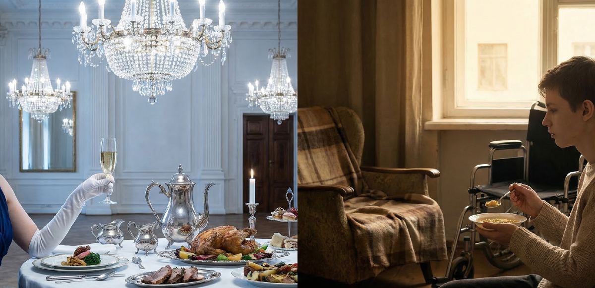 В центре комнаты, спиной к двери, стояла инвалидная коляска. В ней сидел подросток лет пятнадцати. Он был очень худой, его бледная кожа казалась почти прозрачной, а голова была неестественно наклонена набок — явные признаки тяжелого заболевания, возможно, ДЦП или последствий серьезной травмы.