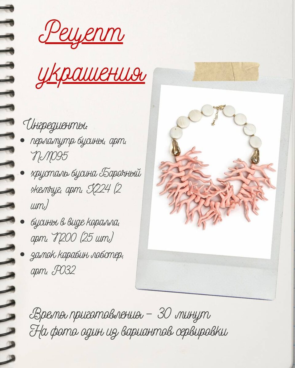 Продолжаем нашу рубрику и сегодня собираем украшение с морским настроением и выразительными фактурами 🌊 Перламутр, хрустальная барочная жемчужина и бусины в виде коралла создают ощущение солнца, солёного воздуха и неторопливого лета. Украшение получается живым, тактильным и очень атмосферным - таким, которое хочется носить ближе к телу и к морю. Рецепт украшения Основные ингредиенты — Перламутр бусины, арт. ПМ095 — Хрусталь бусина Барочный жемчуг, арт. Х224 (2 шт) — Бусины в виде коралла, арт. П200 (25 шт) — Замок карабин лобстер, арт. Р032 Расходники — Кримпы зажимные, арт. М611 — Ювелирный тросик, арт. ТР04 — Разделительные бусины, арт. РА020 Приготовление К ювелирному тросику с помощью кримпов крепим карабин. Далее нанизываем бусины перламутра, чередуя их с разделителями, чтобы добавить ритм и лёгкую графику. Затем переходим к самому вкусному этапу: нанизываем хрустальную барочную жемчужину, после неё 25 бусин в виде коралла, снова хрустальную жемчужину и завершаем перламутром с ра