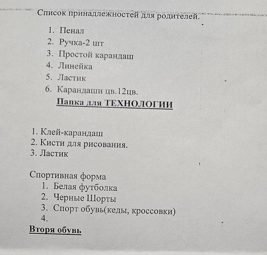 Дима в сентябре идёт в 1 Б класс. Этот список дали то, что самим купить надо. Остальное покупаем вместе с классом. Тетради, рабочие тетради и ещё полный список. Книги выдают бесплатно и также кто не знал, в начальной школе детей кормят бесплатно. Форма одежды как обычно светлый верх и чёрный низ. Для мальчиков повседневная одежда это туфли, брюки с ремнем и рубашки светлых тонов. Парадная одежда это, белая рубашка, брюки и туфли. Учиться они будут первое время с 8.00 до 10.30.