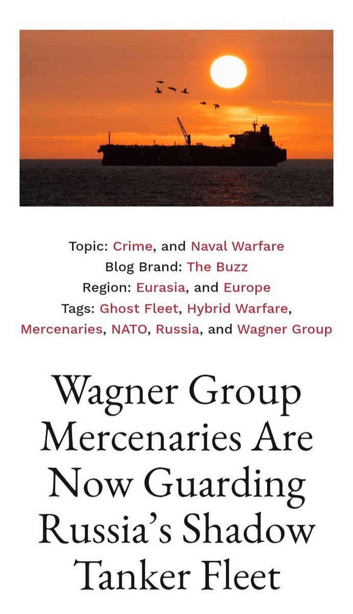 🇺🇸«The National Interest» - о «российских наёмниках», нефтяных танкерах и «угрозе членам НАТО» «Группа Вагнера» продолжает существовать. Возможно, она больше не участвует в боевых действиях на Украине, но теперь обеспечивает безопасность на судах российского «теневого флота». Российская военизированная группировка была поглощена и реорганизована в государственную структуру в июне 2023 года. Группа была переименована в «Африканский корпус», поддерживающий интересы Москвы в этом регионе, и действует теперь под гораздо более жёстким контролем. Согласно новому расследованию, в настоящее время на многих российских судах «теневого флота» присутствуют бывшие сотрудники «Группы Вагнера», чья задача – препятствовать попыткам абордажа со стороны недружественных стран. Эксперты заявляют - помимо поставок нефти, Россия может использовать «теневой флот» для проведения операций асимметричной войны против членов НАТО. Как считает бывший сотрудник ЦРУ, речь определённо идёт не только о защите ро