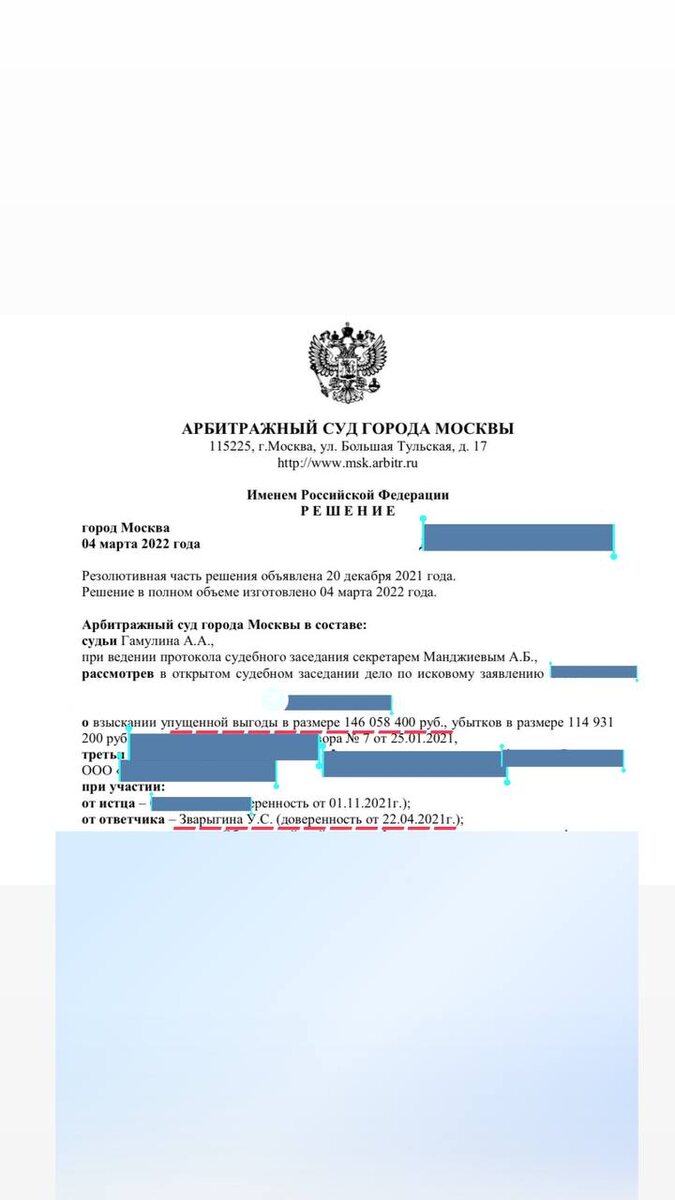 … Я выиграла спор в Арбитражном суде Москвы на сумму 150 миллионов рублей. Суть спора: С моего клиента пытались взыскать убытки по агентскому договору сумму, которая фактически могла привести компанию к банкротству. А за этим стояло не только юрлицо. 300 сотрудников. 300 семей. 300 зарплат, которые могли просто не выплатить. Когда я заходила в этот процесс, я чётко понимала: это не про «поспорить в суде», это про большую степень ответственности, которая порой очень давила. Я разобрала договор до основания, показала, где именно другая сторона пытается натянуть конструкцию убытков. Разложила по полкам причинно-следственную связь (точнее её отсутствие) и, главное, не дала суду уйти в формальность. Это была сложная, долгая и очень напряжённая работа, еще и в одного, юристом в единственном лице (без пула юристов в крутых брючных костюмах с кожаными портфелями). Без красивых обещаний, только стратегия, холодная голова, бессонные ночи и факты. Результат в иске отказано полностью. И