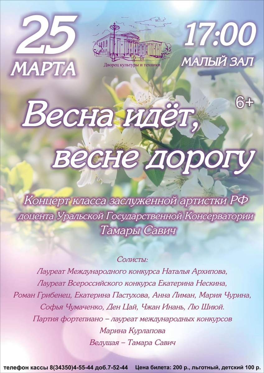 🎶 25 марта в 17:00 в Малый зал на тёплую творческую встречу с прекрасной музыкой "Весна идёт, весне дорогу" Для вас выступят студенты Уральской государственной консерватории им. М.П. Мусоргского Преподаватель Заслуженная артистка РФ, доцент УГК Тамара Савич, концертмейстер Лауреат всероссийских и международных конкурсов Марина Курлапова. В концерте примут участие: - Лауреат Международного конкурса Наталья Архипова, - Лауреат Всероссийского конкурса Екатерина Нескина, Роман Грибенец, Екатерина Пастухова, Анна Лиман, Мария Чурина, Софья Чумаченко, Ден Цай, Чжан Инань, Лю Шиюй. Стоимость билетов: 200 рублей, льготный/детский 100 рублей Телефон кассы: 8(34350) 4-55-44 доб. 7-52-44 ❗️Приобрести билеты можно только за наличный расчёт