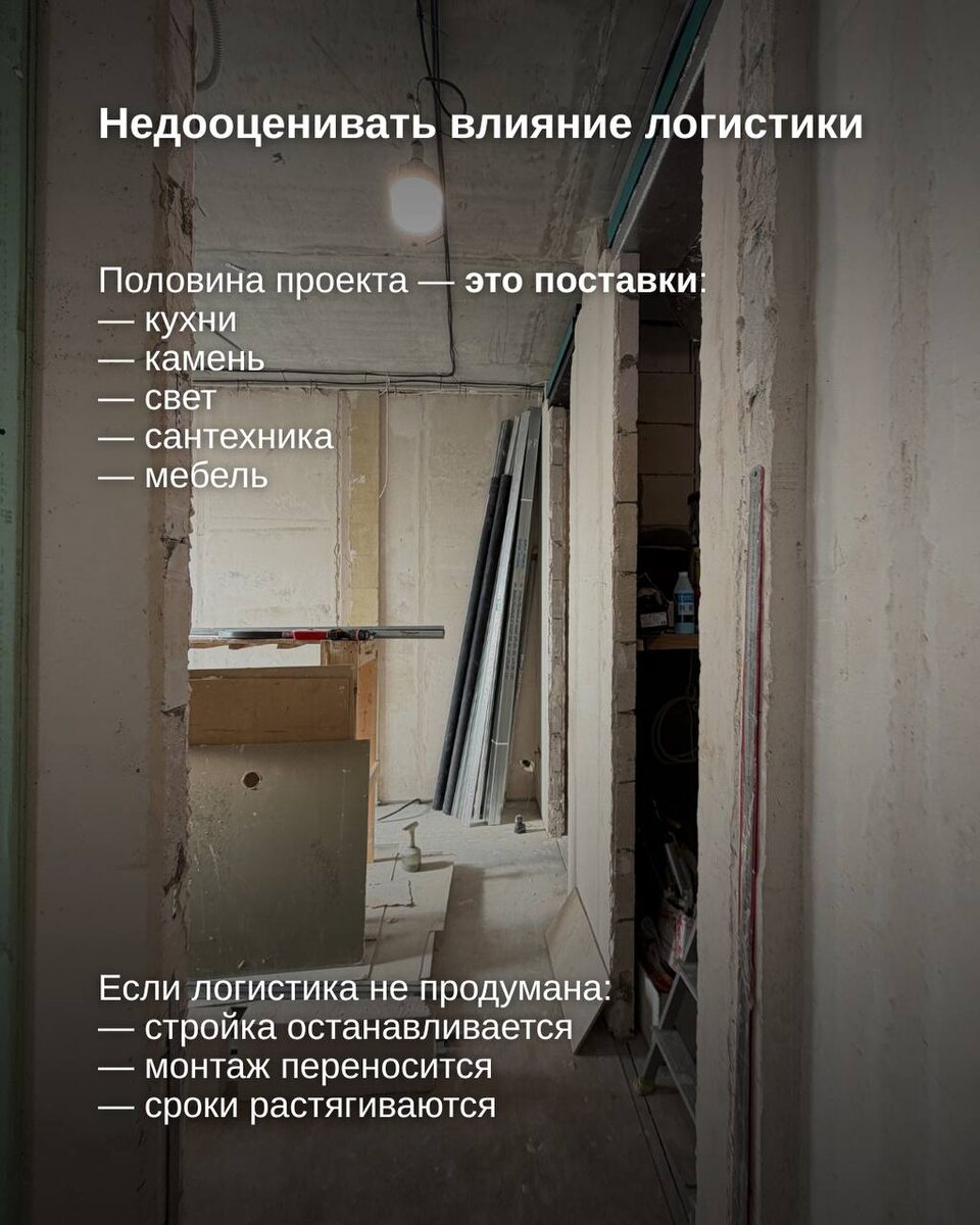 Есть вдохновение Есть красивые картинки Есть ощущение, что всё будет довольно просто А потом оказывается, что интерьер - это не только красивые и вкусные картинки) Это сотни решений! Сотни маленьких деталей! И почти каждое из них влияет на итог сильнее, чем кажется в начале…. Иногда люди думают, что дорогой ремонт может испортить только плохой дизайн Но в реальности всё происходит иначе Большинство проблем возникает не из-за стиля А из-за процесса -Когда решения принимаются слишком поздно -Когда стройка начинается без полной картины -Когда логистика не синхронизирована со строительством -Когда усталость от ремонта начинает влиять на выбор Интерьер - это не просто красивая картинка Это проект, который должен пройти длинный путь: от идеи до реализации И на этом пути важны вещи, о которых редко говорят заранее -Например, что половина ремонта это не стройка, а поставки😳 -Что планировка - это не стены, а сценарии жизни -Что интерьер держится не на декоре, а на пропорциях, свете и