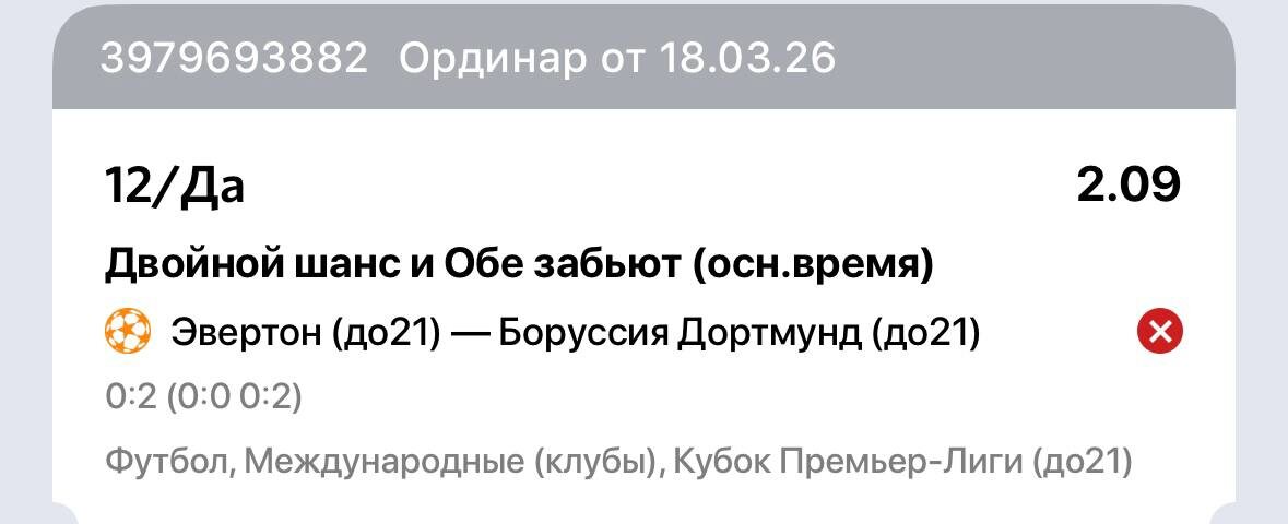 Забирал , потому что, за ОЗ: ✅ у Боруссии Дортмунд 8 матчей подряд - ОЗ ✅ у Эвертон дома ОЗ в 6 из 7 последних встреч Против ничьей: ✅ Эвертон на своём поле 13 из 14 матчей не завершались вничью + Кубковый формат располагает к выявлению победителя По игре 17 ударов у Эвертона , 7 в створ и 0 голов , хотя в целом атаковали норм , но не фарт 🚽