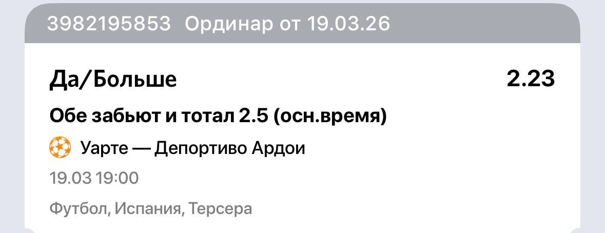 ! ✅ у Ардои в 16 из 17 последних матчей (94%) - ОЗ ✅ Уарте дома пропускает в 8 матчах подряд 😆 ✅ При этом Уарте сам забивает в 11 из 12 игр Обмен голами здесь более чем вероятен да и средний тотал у обоих 3 и 2.8 в среднем за игру 😈