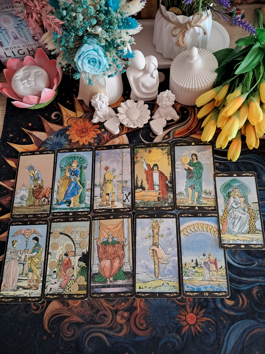 Вас ждет очень позитивный период. Энергия (Сила), деньги (10 Пентаклей), удача в делах (Правосудие) и невероятное счастье в личной жизни (Маг + Туз Жезлов + 10 Кубков). Наслаждайтесь этим моментом, он будет похож на маленький праздник, который вы заслужили.