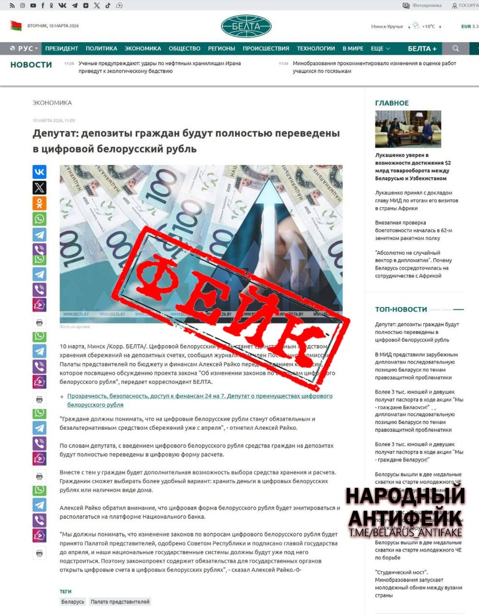 Авторы вброса утверждают, что депозиты физических лиц будут полностью переведены в цифровой белорусский рубль. В качестве «доказательства» новости используется поддельный скриншот с сайта информационного агентства «БелТА». Как вы уже поняли, эта информация не соответствует действительности. 👉О том, что представляет собой цифровой белорусский рубль и для чего он будет использоваться можно ознакомиться в материале агентства по ссылке. Доверяйте только проверенным источникам информации! Сообщить о фейке ______________ Сайт | Instagram | VK | OK | TikTok |Telegram | Чат-бот