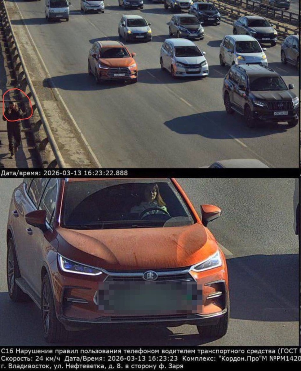 Буквально пару дней назад, в социальных сетях появился фотоснимок с камеры ГИБДД, по которому водителю из города Владивосток, выписали штраф за разговор по телефону во время движения. Согласно фотографии, автомобиль движется по трассе, а водитель — женщина — не разговаривает по телефону и даже в руке его не держит. Тем временем справа от машины по обочине двигается мужчина-пешеход, который явно держит мобильный телефон и разговаривает по нему.