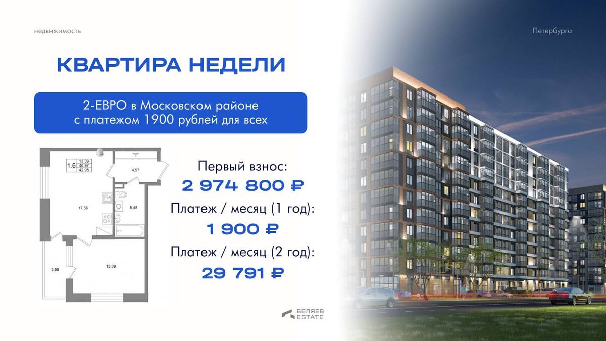 40 м² с отделкой у метро «Московская». Московский район, платёж 1 900 ₽ на первый год — для всех, без дополнительных условий. Расчёт: • первый взнос: 2 974 800 ₽ • платёж на 1 год: 1 900 ₽/месяц • платёж с марта 2027: 29 791 ₽/месяц • далее можно рефинансировать на выгодных условиях Для кого эта квартира: • тех, кто хочет минимальную финансовую нагрузку на первый год — 1 900 ₽ меньше, чем кофе на вынос каждый день • молодых семей и пар — компактная двушка-евро 40 м² с продуманной планировкой • тех, кто ждёт поступления средств — можете рефинансировать после первого или второго года платежей • тех, кто выбирает проверенную и развитую локацию — Московский район, метро «Московская» в шаговой 👉🏻 Оставьте заявку — покажем квартиру и зафиксируем условия