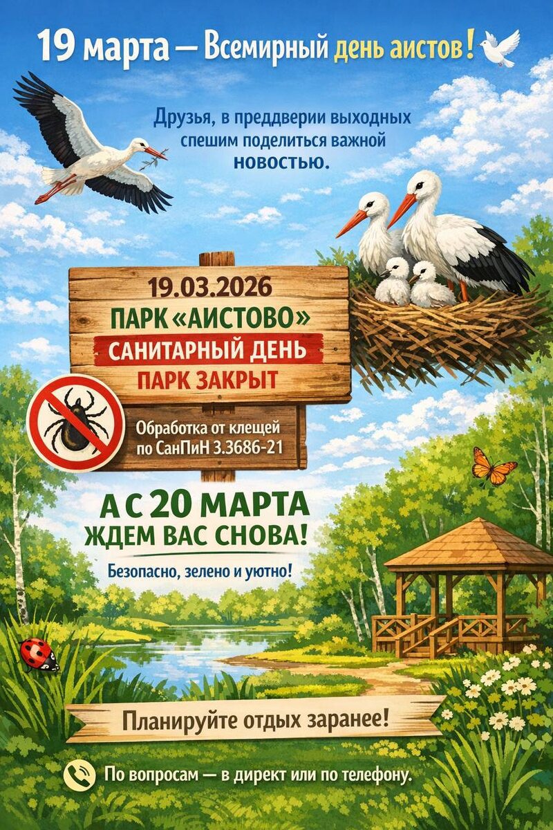 ! 🕊️ Друзья, в преддверии выходных спешим поделиться важной новостью. 19.03.2026 в парке «Аистово» — санитарный день. Проводим обязательную обработку территории от клещей (строго по СанПиН 3.3686-21). Парк будет закрыт. А уже с 20 марта ждём вас на прогулки — безопасно, зелено и уютно. Планируйте отдых заранее! 🌿 По вопросам — в директ или по телефону 386-386.