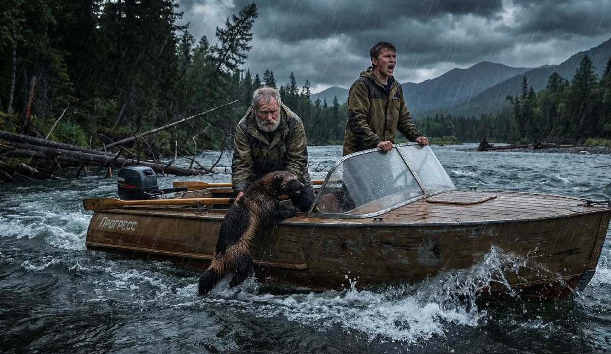 В этот момент на дне полузатопленной лодки зашевелился мокрый комок шерсти. Росомаха очнулась. Почувствовав под ногами твердую опору, зверь мгновенно вскочил. Шерсть на его загривке встала дыбом, обнажились острые клыки. Росомаха издала глухой, угрожающий рык, припадая на мокрые лапы и злобно глядя на людей.