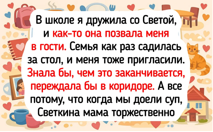 - В школе я дружила со Светой, и как-то она позвала меня в гости. Семья как раз садилась за стол, и меня тоже пригласили. Знала бы, чем это заканчивается, переждала бы в коридоре. А все потому, что когда мы доели суп, Светкина мама торжественно вынесла из кухни огромную общую кастрюлю. Я думала, сейчас будет десерт, но женщина просто начала разливать остатки недоеденного всеми супа обратно в общую кастрюлю, приговаривая: «Ничего, завтра папа доест, не пропадать же добру». Когда она потянулась к моей тарелке, где я специально оставила пару ложек бульона, я поняла, что сыта на неделю вперед.