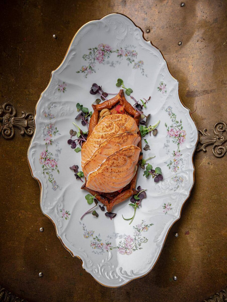 Калитка с лососем — открытый пирог из ржаного теста с томленым картофелем, жареными грибами и луком. Подаем с лососем и соусом на основе белого вина с эстрагоном и красной икрой в «Кафе Пушкинъ».