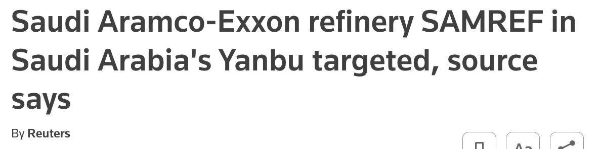 Как сообщает Reuters, удар был по нефтеперерабатывающему заводу SAMREF в саудовском порту Янбу. На фоне перекрытия Ормузского пролива он остается единственным экспортным узлом для сырой нефти из стран залива. 🤗 НАСОНОВ ▶️
