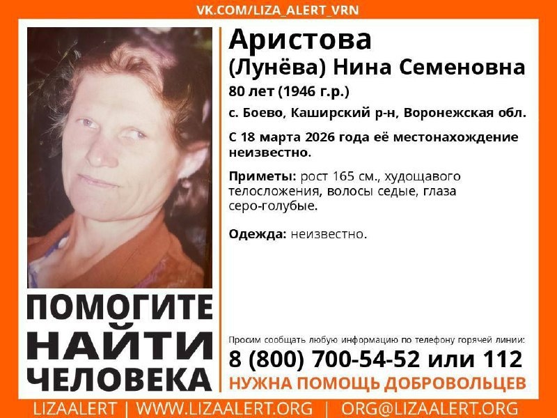 Нина Семёновна Аристова (Лунёва) исчезла из села Боево. Родственники обращаются за помощью к жителям региона. Сообщить сведения о местонахождении пенсионерки можно по телефону горячей линии 8-800-700-54-52 или 112.