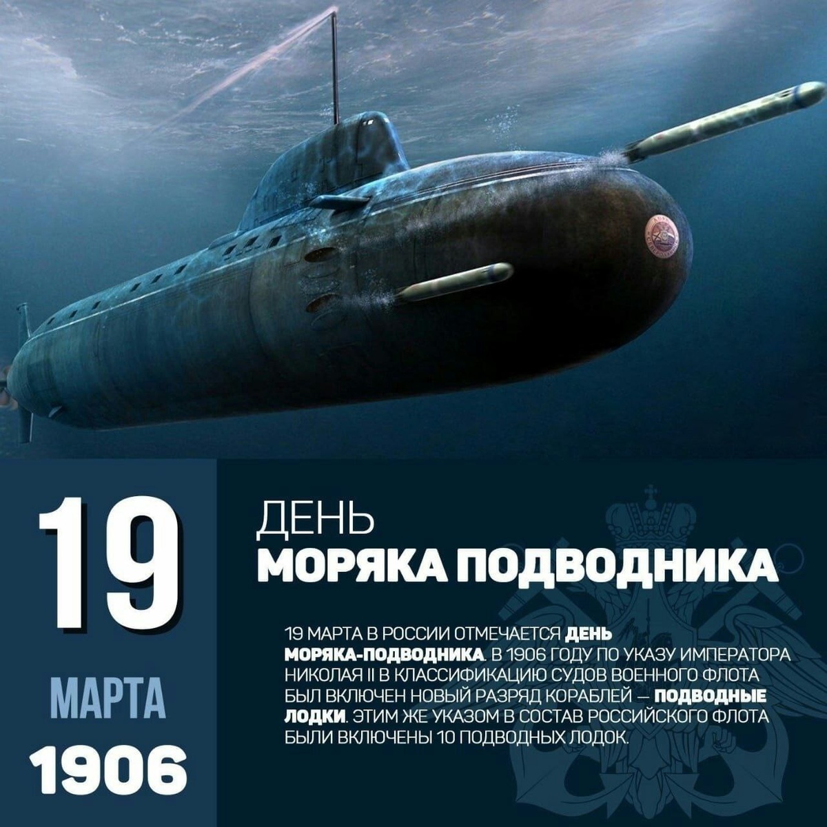 ⚓️ 120 лет назад 19 марта 1906 года Николай II своим указом включил в классификацию судов военного флота новый класс боевых кораблей — подводные лодки. В состав Российского флота были включены 10 подводных лодок с базированием первого соединения подводных лодок в русской военно-морской базе в городе Либава.(С 1920 года Лиепая — город в Латвии). ⚓️ Подводные лодки развивались от деревянных и жестяных лодок до тяжёлых атомных подводных крейсеров. "Потаённое судно" пытались создать ещё при Петре I. Эта идя неоднократно обсуждалась в правительственных кругах России в 17 - 19 веках. ⚓️ В 1879-1881 годах по проекту Джевецкого были построены 50 подводных кораблей. Эти лодки приводились в действие мускульной силой гребца, а предназначались они для обороны приморских крепостей. ⚓️ В декабре 1900 года специальная комиссия приступила к проектированию нового класса подлодок "Миноносец". Позже был переименован в "Дельфин". ⚓️ В марте 1906 года утвердили новый корабельный регламент, в него вклю