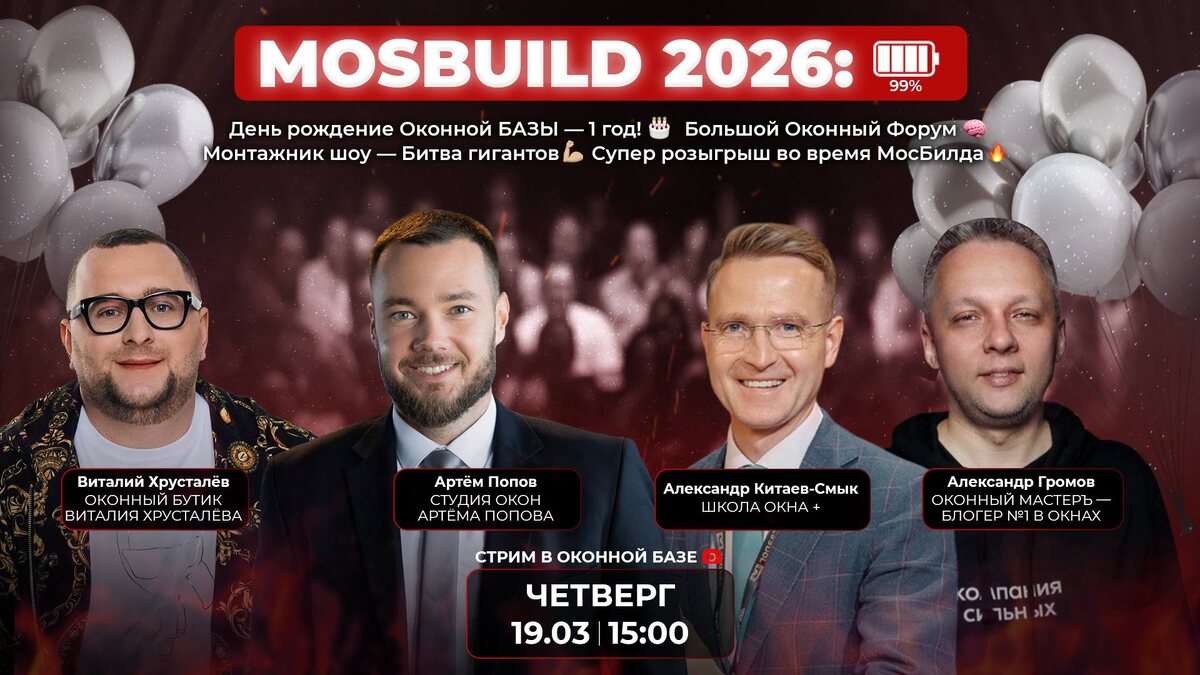 % ⚡️ Мы в шаге до наступления крупнейшей Оконной выставки в РФ: Крокус ЭКСПО: 31.03 - 03.04! 🇷🇺 🗓️ 19 Марта Четверг | 15:00 📹 СТРИМ с ТОП Медиа-личностями Оконной отрасли: ✔️ Александр Китаев-Смык — Основатель ШКОЛА ОКНА+, автор и ведущий на MosBuild'26: 🔹Большой Оконный Форум. Алюминий - 1.04! 🔹Монтажник Шоу. Битва Гигантов - 2.04! ✔️ Виталий Хрусталёв - Оконный Мастодонт Северо-Запада России! ✔️ Александр Громов - Оконный Блогер с крупнейшей аудиторией по всем соц сетям! ✔️ Артём Попов - Основатель крупнейшего Оконной сообщества - Оконная БАЗА! Организатор событий на МосБилд’26; 🔻День Рождение Оконной Базы - 1.04 🔻Крупнейший Супер-Розыгрыш во время МосБилд! 👍 Обсудим: 1. Ключевые события Международной Строительной Выстовки! 💪🏻 2. Новинки МосБилд! 👏🏻 3. Как извлечь максимум из каждого дня! Прямой эфир 19 марта в 15:00 на ОКОННОЙ БАЗЕ! 😊 Повторов не будет! ⚠️ССЫЛКА НА ВЕБИНАРНУЮ КОМНАТУ - ЗДЕСЬ! ⚠️
