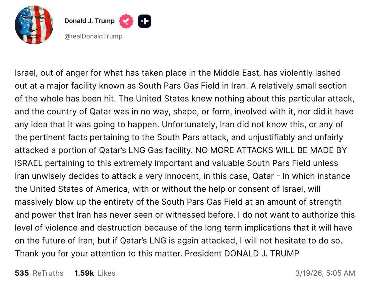 🚫Там заруба целая, Трамп публично отчитал Израиль за атаку на нефтегазовую инфраструктуру Ирана. При этом он отметил, что Израиль, фактически, виноват в том, что Иран в ответ ударил по крупнейшему в мире газоконденсатному комплексу, расположенному в Катаре. Ну и заключение: он публично пообещал, что Израиль больше без согласования не будет атаковать нефтегазовую инфраструктуру Ирана. Пауки в банке Начало! 💬There's a whole log cabin there, and Trump has publicly chastised Israel for attacking Iran's oil and gas infrastructure. At the same time, he noted that Israel is actually to blame for the fact that Iran retaliated by hitting the world's largest gas condensate complex located in Qatar. Finally, he publicly promised that Israel would no longer attack Iran's oil and gas infrastructure without agreement. The spiders in the jar are the beginning!