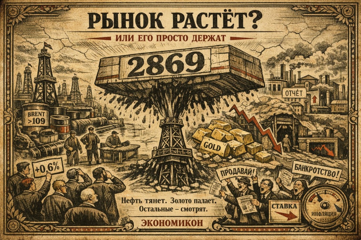 ! На связи утренний дайджест Economicon ☕️ Четверг. 19 марта. Рынок вроде идёт вверх. По ощущениям — просто держится. 💱 Валюта и сырьё на сегодня: $ — 83,12 € — 94,66 ¥ — 12,11 Gold — <4864 Brent — >109 📊 Сегодня в календаре ▪️ Индекс ММВБ прибавил +0,6% и дошёл до 2869 пунктов. Рост есть, но радости от него немного. ▪️ Рынок продолжает ходить в боковике. Движение есть, направления — не очень. ▪️ Нефтегазовый сектор остаётся главным драйвером. Когда нефть растёт — рынок подтягивается. 🇷🇺 Россия ▪️ Основной рост обеспечен нефтью. Без неё картина выглядела бы заметно слабее. ▪️ Инфляция за период — 0,08% против 0,11% ранее. Темп снижается, рынок начинает ждать движения по ставке. ▪️ С начала года — 2,59%, годовая — 5,91%. Цифры выглядят спокойно, но рынок уже думает наперёд. 📉 Металлы и добытчики ▪️ Золото ушло ниже 4864. Сектор сразу почувствовал давление. ▪️ Бумаги Полюса снижаются заметно сильнее. Рынок сейчас не любит слабость. ▪️ ЮГК просел, но удержался в пределах ~17%.