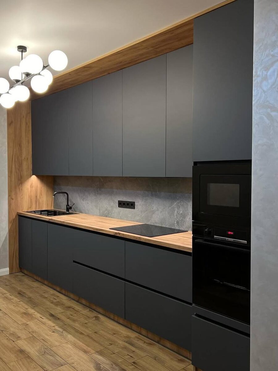 Тёмный графит + тёплая текстура дерева — сочетание, которое не надоедает и всегда выглядит актуально. Почему это хороший выбор: ▪️ Практичность На графите меньше видно загрязнения и следы повседневного использования. ▪️ Тёплый контраст Дерево «смягчает» тёмный цвет — кухня не выглядит холодной. ▪️ Визуальная глубина Интерьер смотрится объёмно и дороже за счёт сочетания фактур. ▪️ Универсальность Подходит и для минимализма, и для более уютных интерьеров. Такая кухня выглядит сдержанно, но с характером. В ДК Мебель мы подбираем сочетания так, чтобы они оставались актуальными и удобными в жизни. Графит + дерево — одно из самых удачных сочетаний: практично, тепло и визуально дорого.