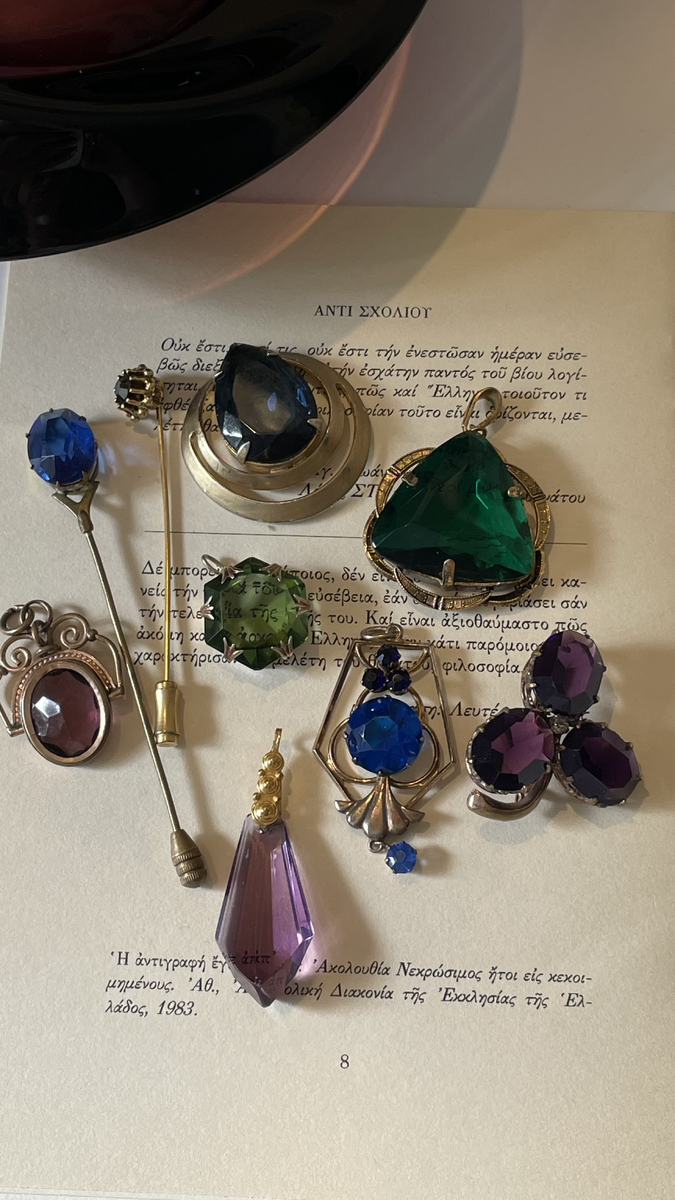 Друзья, привет! Сегодня кратко, потому что это лишь анонс очередного выпуска из АВТОРСКОГО ЦИКЛА О ВИНТАЖНОМ СТЕКЛЕ, над которым я сейчас усердно работаю. В моей коллекции не так уж и много винтажных и уж тем более антикварных украшений со стеклом в принципе, так что покажу вам сборную солянку, можно сказать, FRUIT SALAD из того, что я наскребла по сусекам. Здесь и советские хорошо знакомые всем кулоны, пара чехословацких, антикварный брелок-спиннер для часовой цепи и мой любимый трилистник так хорошо знакомый давним читателям этого канала. Они все разные, из разных эпох, выполнены из разных металлов, в разных техниках и совершенно разных стилях. Стеклянные вставки в них тоже самых разных цветов, как вы видите, но есть одно качество, которое роднит их и является общим для столь разношерстных украшений. И я уверена, что я мне не нужно писать, что же общего может быть у всех этих стекляшек, потому что абсолютное большинство из вас уже поняли, какое именно стекло станет героем нового вы