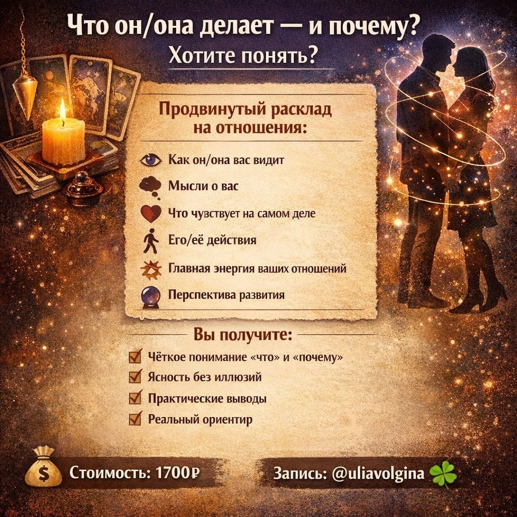 ? Расклад на отношения У многих запрос в раскладах на отношения на классический расклад «мысли — чувства — действия (МЧД)». И это нормально — с этого удобно начинать. ☝ Но такие расклады часто дают фрагменты, а не целостную картину. Я работаю глубже. На консультации я разбираю динамику связи между вами, чтобы стало понятно не только что человек думает или чувствует, но и 👍 почему он/она ведёт себя именно так и куда всё движется. 🃏 В базовой консультации — развёрнутый расклад из 6 позиций, который даёт цельную картину ваших отношений. 🃏 Что смотрим (базовая консультация — 6 вопросов): 1⃣ Как он/она вас воспринимает сейчас — какой образ сложился и какое место вы занимаете в его/её внутренней картине. 2⃣ Мысли о вас и ваших отношениях — планы, сомнения, ожидания, внутренний диалог, мысли о вас и ваших взаимоотношениях. 3⃣ Что реально чувствует, а не только то, что показывает — глубинные эмоции, даже те, о которых молчит. 4⃣ Его/её действия — как это проявится в поведении и поступ