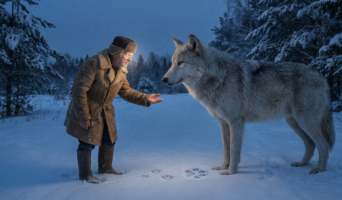 Волк медленно, с достоинством подошел к лежащему человеку. Иван замер. Хищник наклонил голову и осторожно, совсем как в детстве, ткнулся мокрым холодным носом в морщинистую щеку старика, шумно втягивая знакомый запах.