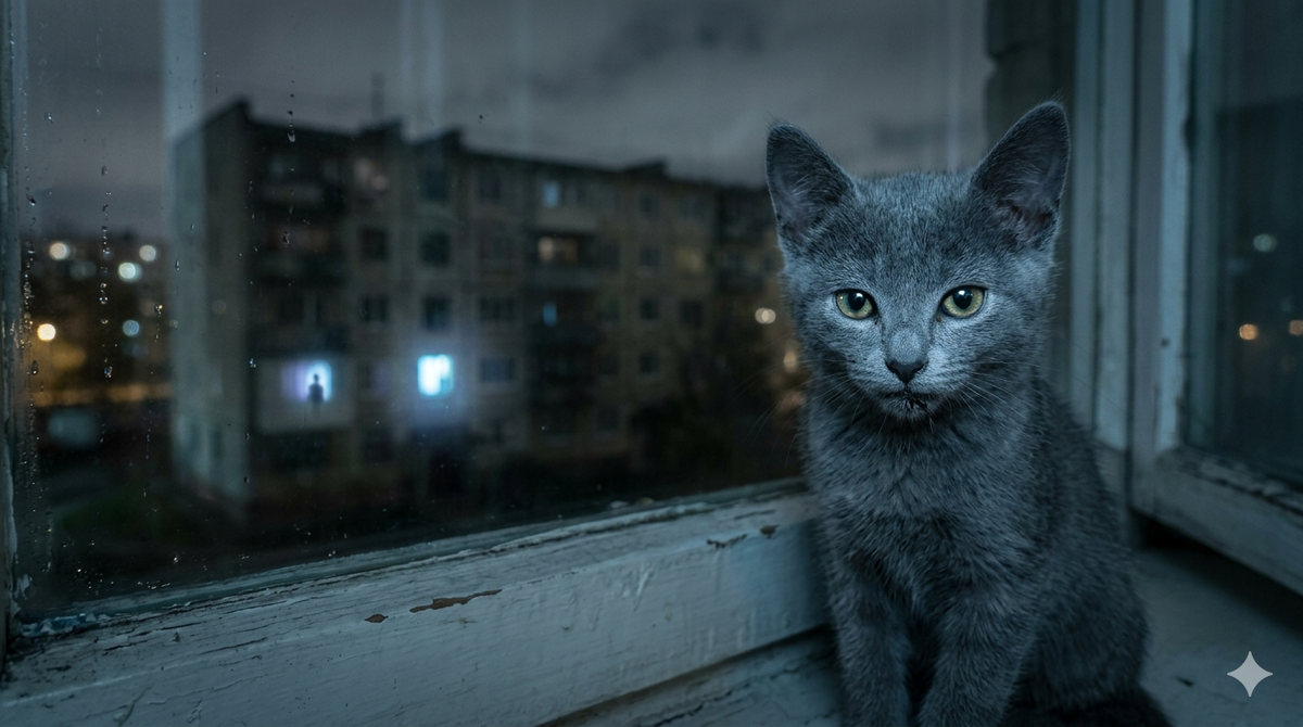 Дымка вдруг сорвалась с места. Она не побежала к двери, как обычный кот. Котёнок прыгнул на подоконник, вцепившись когтями в занавеску, и начала рвать её с безумной силой, при этом издавая звуки, похожие на человеческий стон, переходящий в шипение. Её взгляд был прикован к тёмному окну, выходившему во двор.