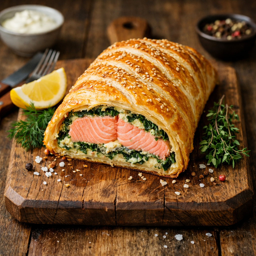Слоёный пирог "Рыбный бриз" с форелью и зеленью