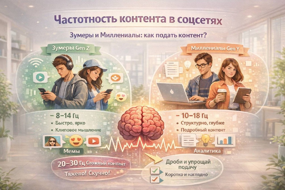 Почему один и тот же смысл «заходит» или усыпляет И как работать с зумерами и миллениалами без деградации смысла Теория частотности легко переходит в прикладной маркетинг. Сегодня основной потребитель digital-контента – это: • зумеры • младшие и средние миллениалы Это важно учитывать не как возраст, а как психофизиологический режим восприятия. Контент больше не читают, его сканируют. Не удерживают – а пробегают. Не проживают – а реагируют. И это не потому, что люди «глупее». Это потому что изменилась базовая частотность среды. 1. Базовая частотность цифрового поколения Средние рабочие диапазоны (обобщённо) Зумеры (Gen Z) • базовый режим восприятия: 8-14 Гц • быстрые стимулы, короткие циклы • высокая чувствительность к новизне • низкая толерантность к когнитивной перегрузке Миллениалы (Gen Y) • базовый режим: 10-18 Гц • лучше держат структуру • хуже держат длинные абстракции без якорей • быстрее устают от «умного ради умного» Это не интеллект, а привычный режим н