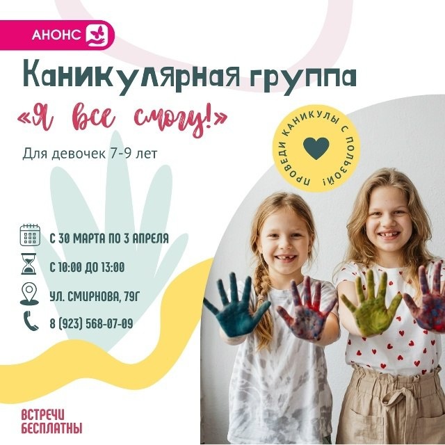 разработанной для этого возраста ✨ В учреждении создано пространство, где можно: 👉 познакомиться со своими эмоциями, научиться понимать и выражать чувства; 👉 найти новых подруг и расширить круг общения; 👉 весело и интересно провести время, играя и развиваясь. Занятия бесплатные, будут проходить по адресу: г. Барнаул, ул. Смирнова 79-г ежедневно с 30 марта по 3 апреля включительно с 10:00 до 13:00. Количество мест ограничено! 📌 ️ Для записи необходимо прийти на родительское собрание, которое состоится 24 марта в 18:00. Подробности по телефону 8 (923) 568-07-09.