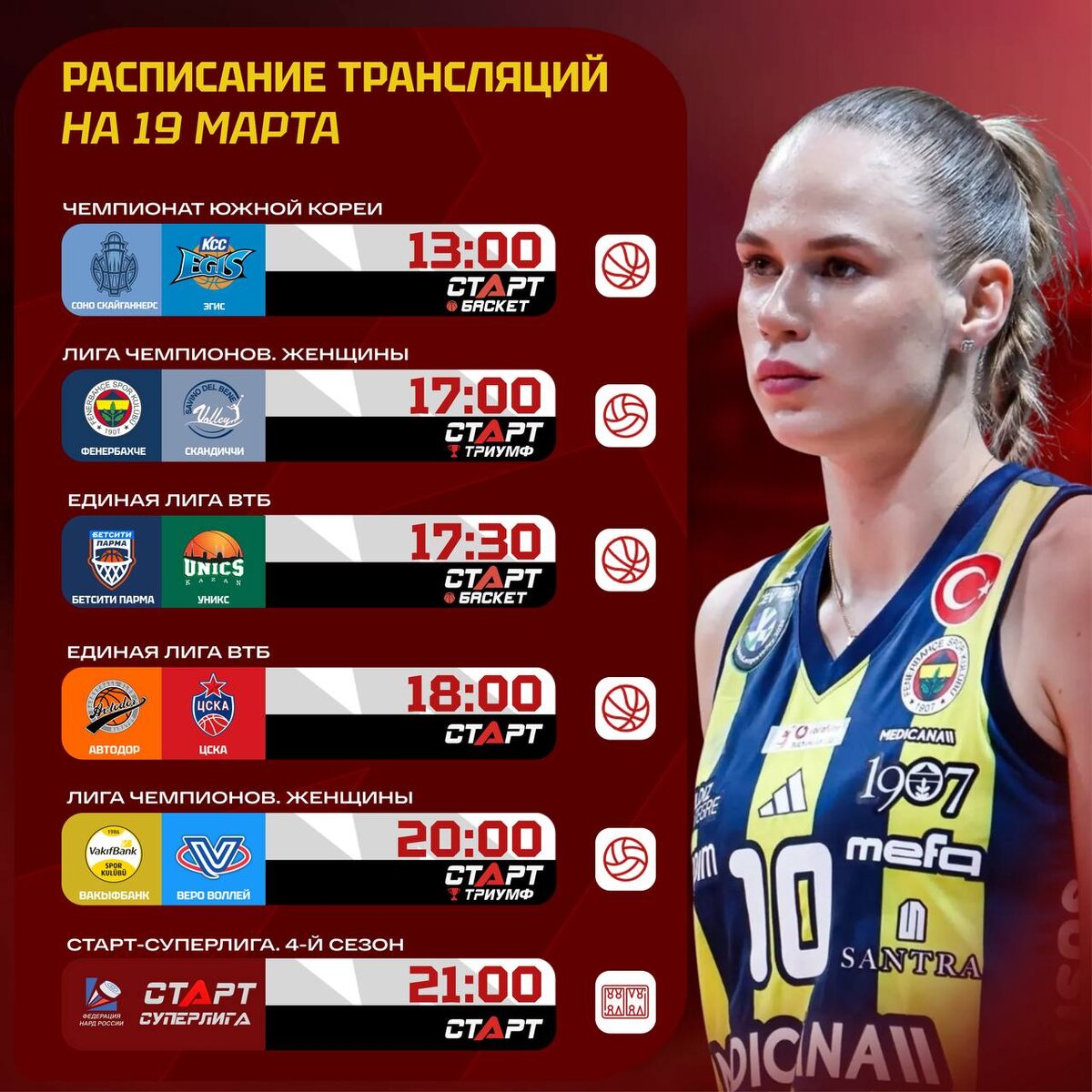 ! ΠΠΎΡΠ΅ΠΉΡΠΊΠΈΠΉ Π±Π°ΡΠΊΠ΅ΡΠ±ΠΎΠ» Π·Π°ΠΏΠ»Π°Π½ΠΈΡΠΎΠ²Π°Π½ Π½Π° Π΄Π΅Π½Ρ, Π° Π½Π° Π²Π΅ΡΠ΅Ρ β ΠΠΈΠ³Π° Π§Π΅ΠΌΠΏΠΈΠΎΠ½ΠΎΠ² Ρ ΡΠΎΡΡΠΈΠΉΡΠΊΠΈΠΌΠΈ Π²ΠΎΠ»Π΅ΠΉΠ±ΠΎΠ»ΠΈΡΡΠΊΠ°ΠΌΠΈ ΠΈ ΠΠ΄ΠΈΠ½Π°Ρ ΠΠΈΠ³Π° ΠΠ’Π! ΠΡΠ΄Π΅Π»ΡΠ½ΠΎΠ΅ Π²Π½ΠΈΠΌΠ°Π½ΠΈΠ΅ Π·Π°ΡΠ»ΡΠΆΠΈΠ²Π°Π΅Ρ Π½Π°Ρ ΡΠΈΡΠΌΠ΅Π½Π½ΡΠΉ ΡΡΡΠ½ΠΈΡ ΠΏΠΎ Π½Π°ΡΠ΄Π°ΠΌ. ΠΠ±ΡΠ·Π°ΡΠ΅Π»ΡΠ½ΠΎ ΠΏΠΎΡΠΌΠΎΡΡΠΈΡΠ΅ Π½ΠΎΠ²ΡΡ ΠΈΠ³ΡΡ ΡΠ΅Π·ΠΎΠ½Π° π₯ ΠΠΎΠ΄ΠΏΠΈΡΡΠ²Π°ΠΉΡΡ Π½Π° Π’Π Π‘Π’ΠΠ Π’ Π² MAXπ²