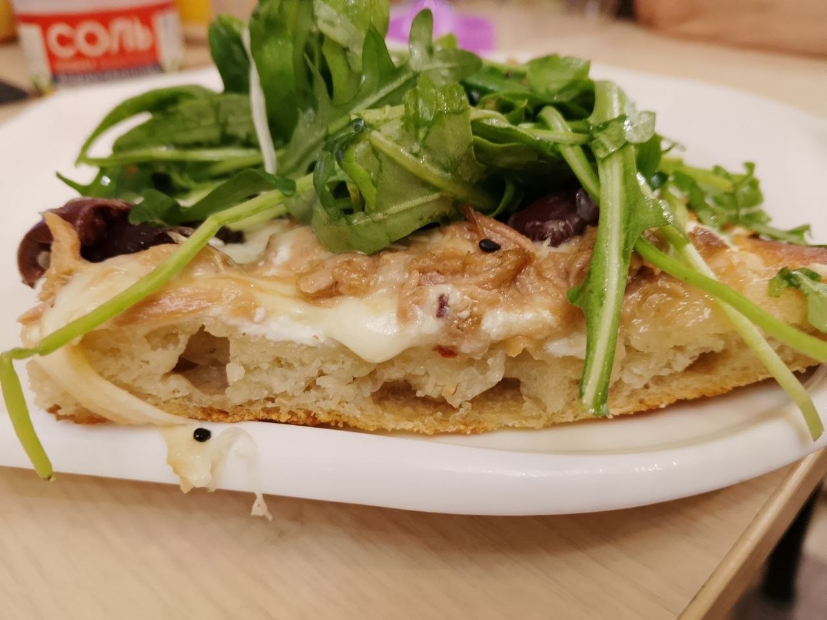 - Вытащите пиццу из духовки, смажьте рикоттой, поперчите, добавьте моцареллу и тунец.