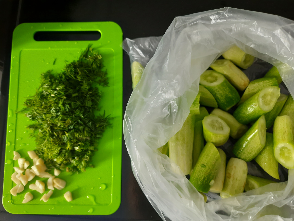 Делаю я это просто: огурцы помыла, отрезала "попки", разрезала пополам. Укроп и чеснок мелко порубила.
