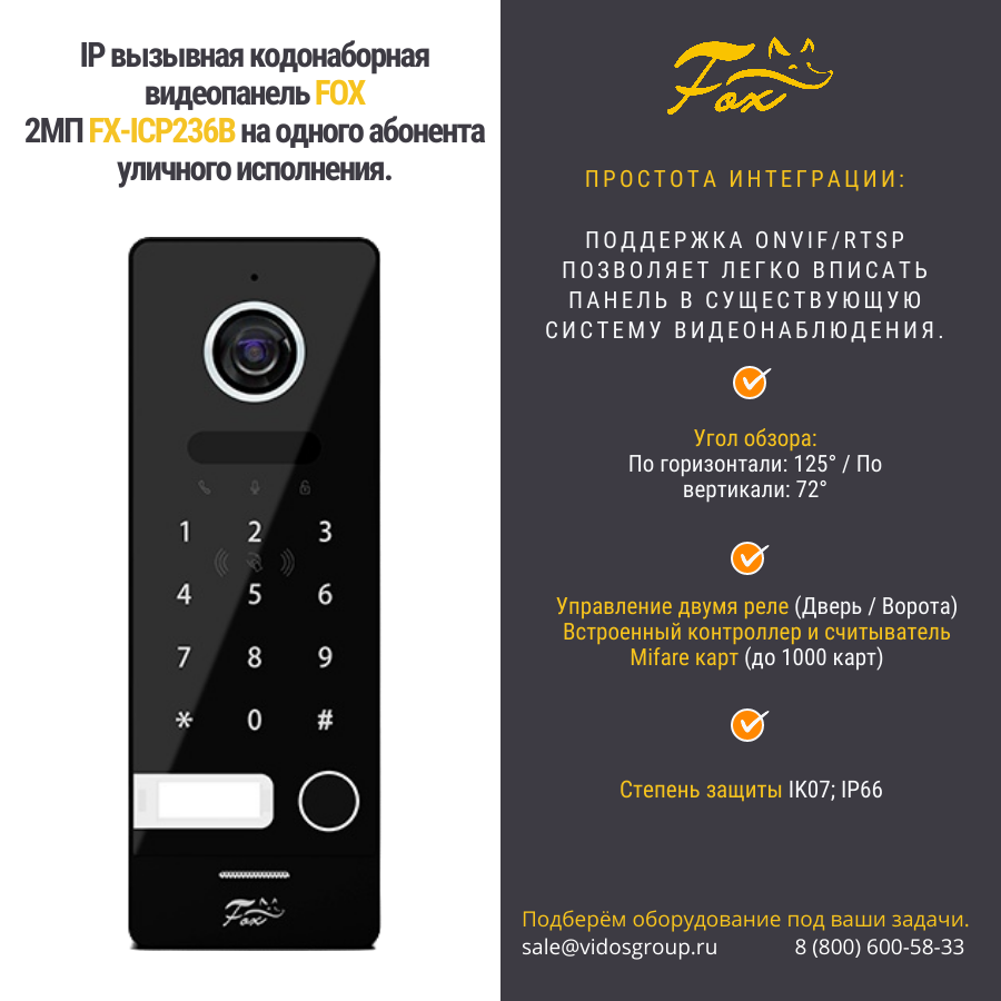 Панель поставляется с монтажным уголком (в комплекте!), что сильно упрощает установку и придает эстетичный вид. Итог: Если вам нужно управлять воротами и дверью, контролировать периметр по IP и не бояться вандалов или погоды — FX-ICP236B ваш выбор. Подберём оборудование под ваши задачи. sale@vidosgroup.ru 8 (800) 600-58-33 Есть вопросы по настройке или подключению к монитору?