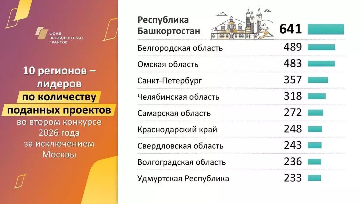 От региона поступила 641 заявка. Башкирия заняла первое место среди субъектов России по количеству поданных заявок на второй конкурс президентских грантов 2026 года (за исключением Москвы). От региона поступила 641 заявка, что значительно превышает показатели других регионов. Для сравнения, в Белгородской области подано 489 заявок, а в Омской области — 483 проекта. Всего на конкурс было подано 10 222 проекта из 89 регионов страны. По словам председателя Общественной палаты РБ Энже Ахмадуллиной, сегодня в республике развивается по-настоящему зрелое и активное гражданское общество: «Люди сами становятся инициаторами перемен и берут ответственность за развитие территорий. Через социальные проекты, общественные инициативы и участие в грантовых конкурсах жители объединяются, меняют жизнь вокруг себя, создают новые возможности для сообществ и поддерживают друг друга». Эксперты ресурсного центра аппарата Общественной палаты Башкортостана отмечают, что такой уровень активности некоммерческого