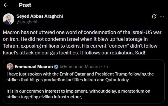 "Макрон не произнес и слова в осуждение войны США и Израиля против Ирана. Он не осудил Израиль, когда тот подорвал топливные хранилища, подвергнув миллионы людей воздействию токсинов. Его нынешняя "обеспокоенность" не последовала за атакой Израиля на наши газовые объекты. Она последовала после наших ответных действий. Печально!", - написал Аббас Аракчи в соцсети X. Ранее французский президент созвонился с эмиром Катара, заявив о необходимости ввести мораторий на удары по гражданской инфраструктуре. 🔴 Читайте Sputnik Беларусь в MAX