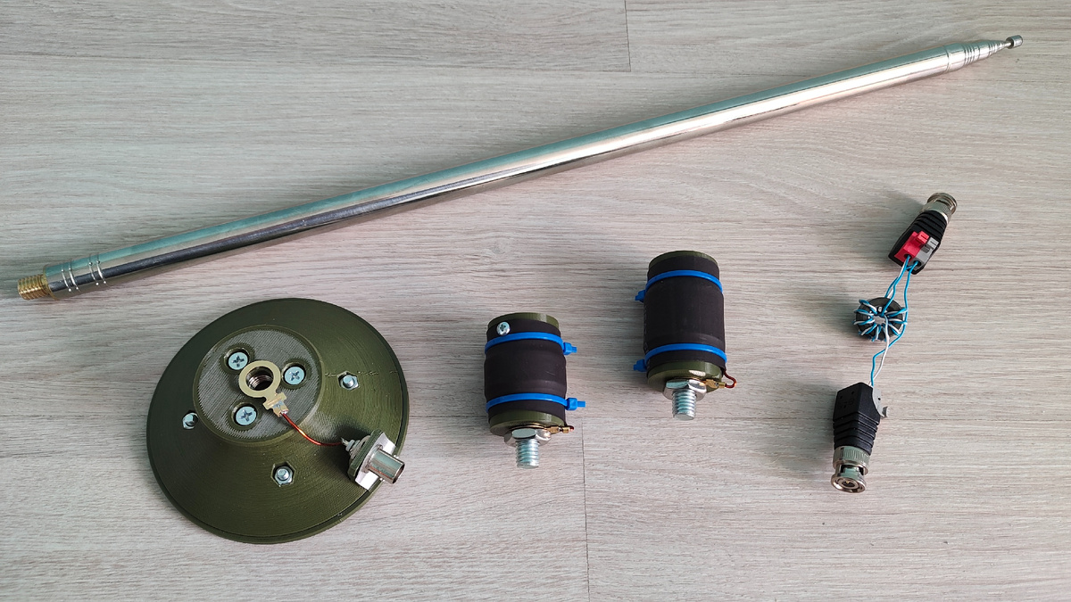 Сразу переходим к 21 МГц. Для этого убираем все катушки и устанавливаем телескоп непосредственно в магнитное основание. Согласующий трансформатор тоже не ставим,ведь теперь штырь можно настроить непосредственно на четверть волны.