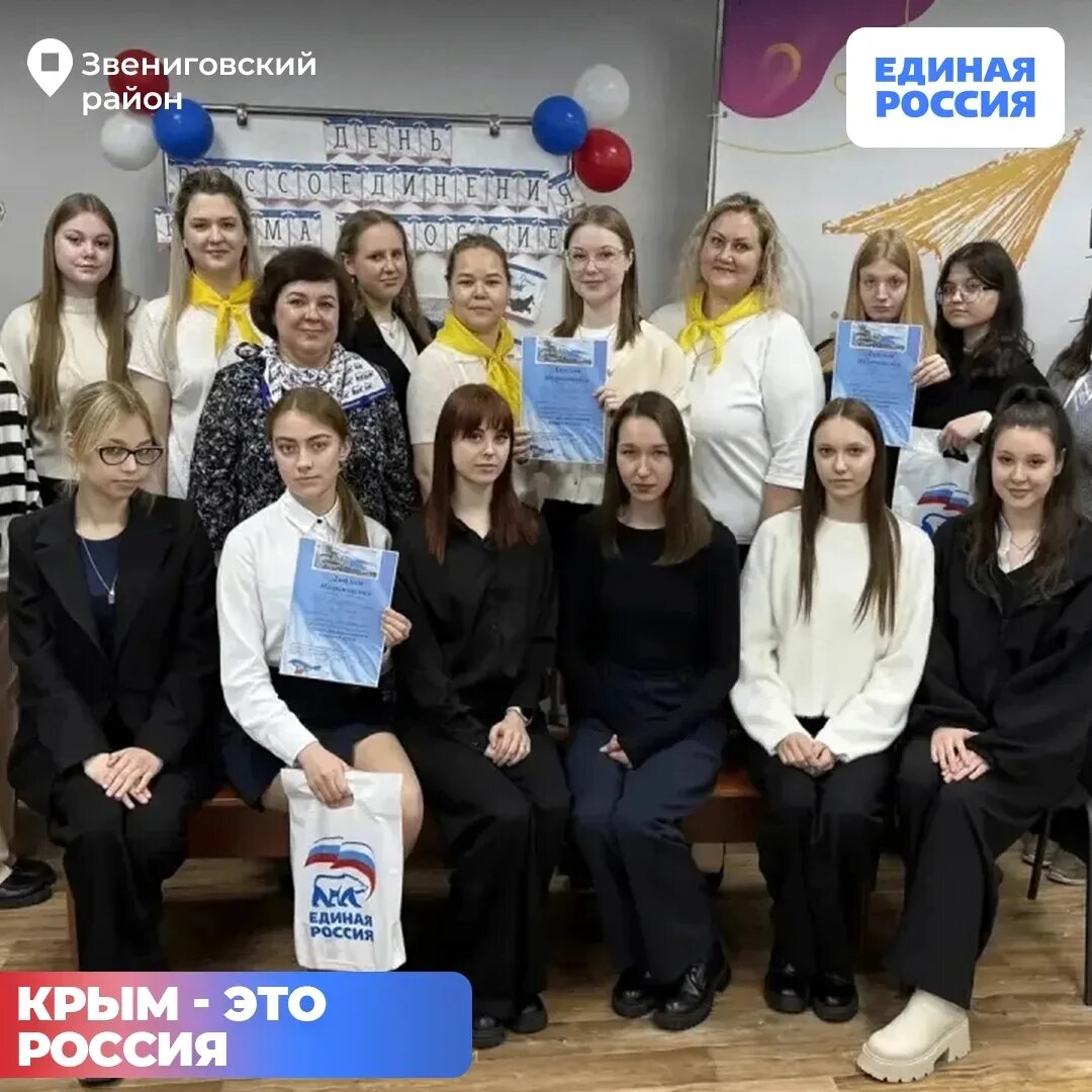 18 марта, в День воссоединения Крыма с Россией, Звениговское местное отделение «Единой России» совместно с советниками директоров школ организовало для старшеклассников квиз «Крым — это Россия». Участники не просто отвечали на вопросы, а отправились в виртуальное путешествие по истории и культуре полуострова. Перед началом игры ребята узнали удивительные факты о Крыме, а затем в течение четырёх раундов развернулась настоящая интеллектуальная битва. Школьники размышляли, спорили, искали истину и делали маленькие открытия. Но в главном все были единодушны: Крым вернулся домой, и это навсегда.