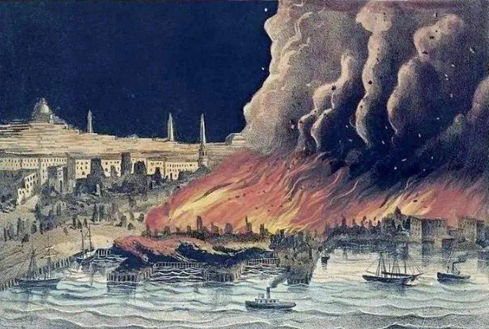 Сложная планировка города и нерасторопность местных пожарных, помноженные на неблагоприятные погодные условия, — все это вкупе привело к огненному торнадо, полностью выжегшему большую часть города и оставившему без крыши над головой почти 100 тысяч человек. Чтобы остановить разгул преступности в опустошенном городе, правительству пришлось срочно ввести в нем военное положение. Для контроля ситуации туда была переброшена армейская группировка под командованием героя Гражданской войны в США генерала Шеридана.