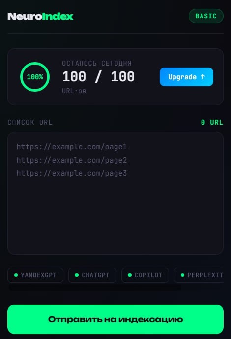 ? Нейросети типа ChatGPT обучены на срезе данных и не индексируют сайты в реальном времени как поисковик. Perplexity и Copilot – да, подтягивают актуальный веб. Яндекс GPT работает в связке с поиском Яндекса. Есть способы ускорить этот процесс. Подать URL напрямую, не ждать пока бот сам найдёт страницу. Сейчас тестирую сервис для индексации в нейросетях на реальных проектах. Инструмент решает это просто: вставляешь список URL, нажимаешь кнопку и страницы отправляются на обработку сразу во все подключённые нейросети.