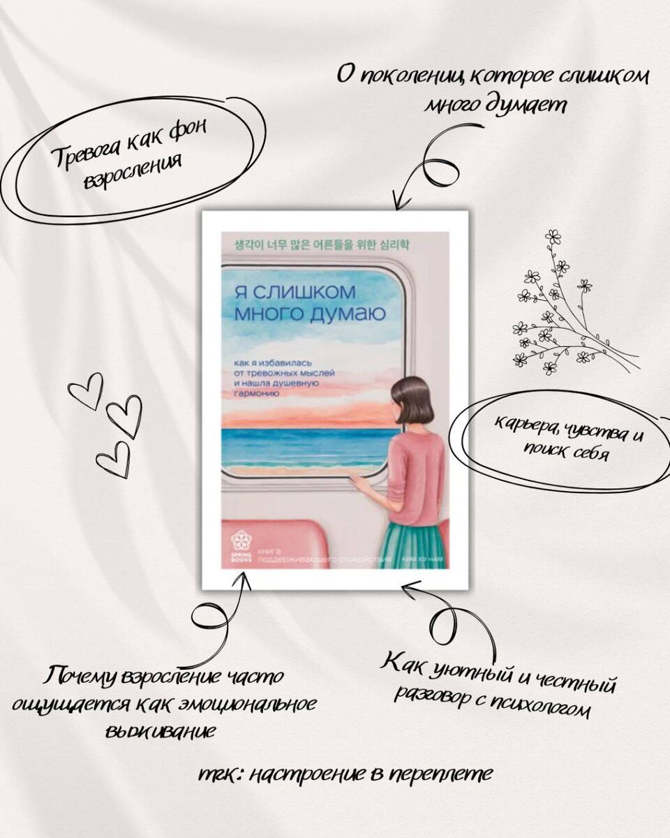 ⭐️ Если вам сейчас особенно нужны не советы, не чёткие шаги к «новой жизни» и не очередная мотивация, а спокойные книги, которые будто бережно ведут за руку, – сохраняйте эту подборку. Здесь книги корейских авторов о тревоге, внутренней опоре, праве быть неидеальными, умении говорить «нет» и поиске своего пути. Они не читаются как лекции и не обещают мгновенного исцеления. Это скорее вдумчивый разговор – мягкий, честный и очень человеческий. 💗Я слишком много думаю | Ким Хе Нам Книга о тревоге как фоне взрослой жизни. О поколении, которое слишком много думает, слишком много держит в себе и слишком часто проживает взросление как эмоциональное выживание. Очень уютный и честный текст, который ощущается почти как разговор с психологом. 💗Тебе пора ошибаться | Ким Ын Джу Поддерживающая книга для тех, кто боится начать, сомневается в себе и слишком долго ждёт подходящего момента. Здесь много важных мыслей о страхе ошибки, внутренней силе, движении вперёд и о том, что именно промахи порой