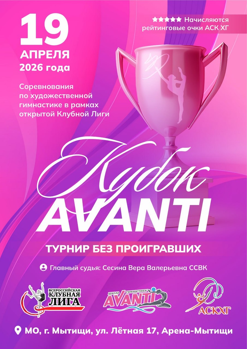 »🌟 19 апреля 2026 года в Подмосковье состоится яркий старт Клубной Лиги, где каждая гимнастка уходит с наградой и опытом ✨ 🗓Дата: 19 апреля 2026 г. 📍Место проведения: Московская область, г. Мытищи, ул. Лётная, 17Г. Арена-Мытищи (вход в Универсальный спортивный комплекс — со стороны ул. Матросова, 21/18) 💫Особенности турнира: — формат «без проигравших» — внимание и награды для каждой участницы; — соревнования проходят в рамках Открытой Клубной Лиги; — всем участницам начисляются рейтинговые очки Клубной Лиги, влияющие на позиции в общем рейтинге и дальнейшие старты. 🎯Организатор: СК «Школа гимнастики AVANTI» ⚖️Главный судья: Сесина Вера Валерьевна 🔗Подробности и положение — на сайте: https://rgclubsleague.com/schedule/kubok-avanti633_10781/?clear_cache=Y Готовимся к красивому, тёплому и по-настоящему клубному турниру💖