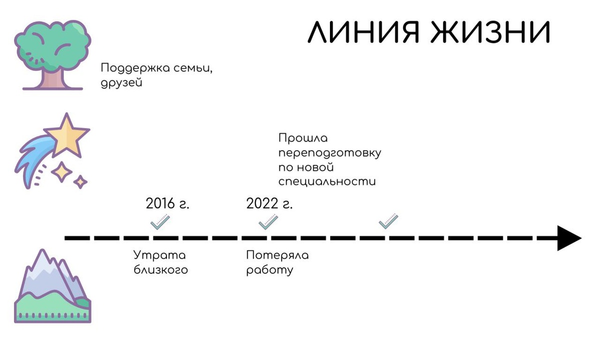 ! Сегодня разберём технику «Линия жизни» — простой способ увидеть свои ресурсы и прогресс, даже когда кажется, что всё плохо. 🤔Что даёт техника: помогает осознать, что трудности — временные; визуализирует накопленный опыт преодоления; напоминает о точках опоры в кризисный момент. Как выполнить: Нарисуйте горизонтальную линию — это ваша жизнь от прошлого к будущему. Отметьте важные события: 🏔трудности (развод, потеря работы, болезнь) — внизу линии; 💫достижения (окончила курс, научилась новому, помогла кому‑то) — вверху линии; 🌳ресурсы (люди, хобби, навыки) — подпишите рядом с точками. В конце добавьте 2–3 точки‑цели 🎯 на будущее (с ресурсами для их достижения). Пример: 2018 г. — потеря работы (трудность); 2019 г. — курсы психолога (достижение) + поддержка подруги (ресурс); 2023 г. — новый проект (достижение) + навык тайм‑менеджмента (ресурс). 🛡Когда применять: - в моменты отчаяния («ничего не получается»); - для планирования будущего; - как упражнение с клиентом