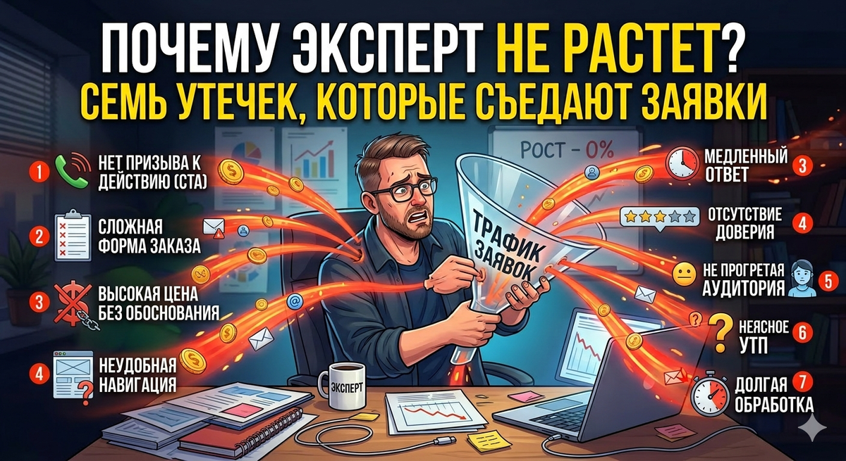 Но чаще проблема не в тебе. Проблема в системе. Я называю это “дырявое ведро”: ты наливаешь усилия (контент, время, деньги), а заявки и рост утекают на каждом шаге. Ниже — 7 утечек, которые я вижу у экспертов чаще всего.