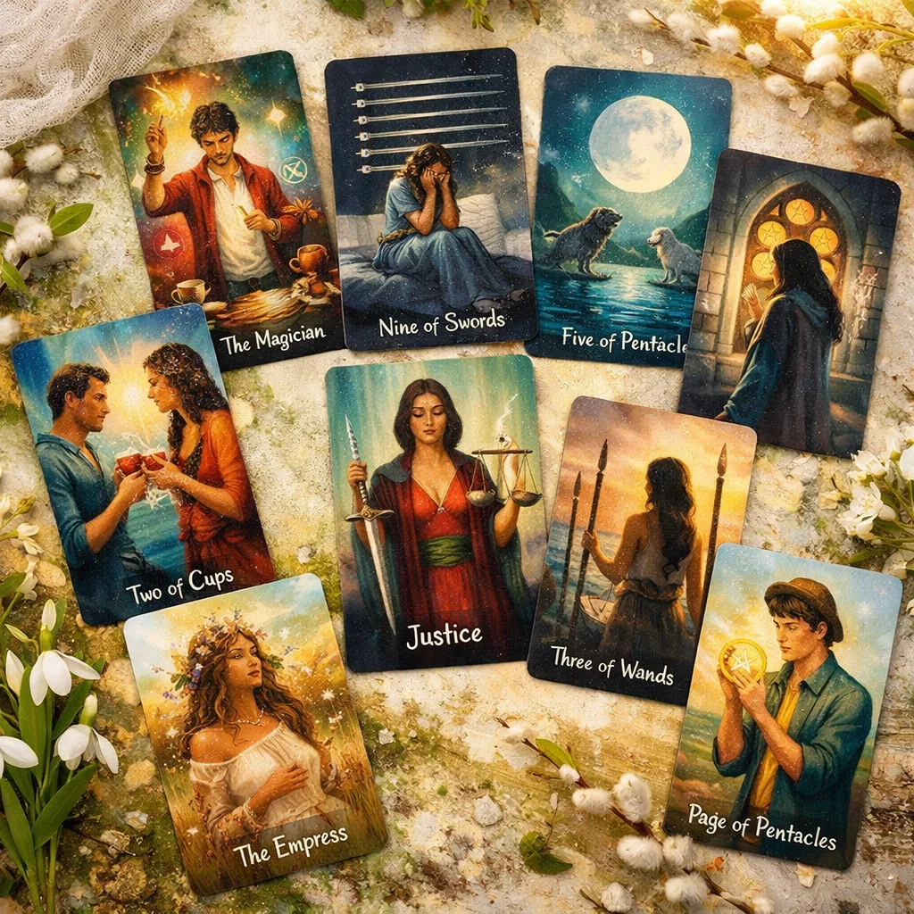 Карты расклада: Маг, Луна, Девятка мечей, Пятёрка пентаклей, Двойка кубков, Правосудие, Тройка жезлов, Императрица, Паж пентаклей.