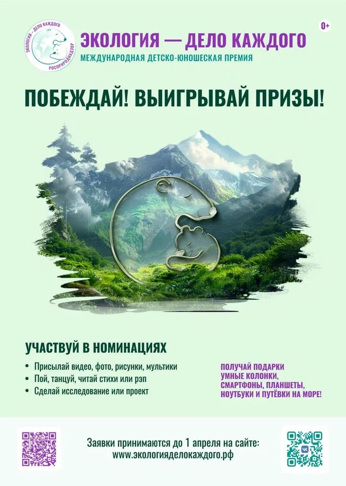 ! ✅ Покажи своё отношение к сохранению природы в 13 творческих номинациях премии «Экология — дело каждого» 🌱 🗓 Заявки принимаются до 1 апреля на сайте 👉🏻 экологияделокаждого.рф Количество работ не ограничено во всех номинациях! 🏅 Всех участников ждут грамоты, наставников — благодарности, а победителей и призёров — самые классные подарки!