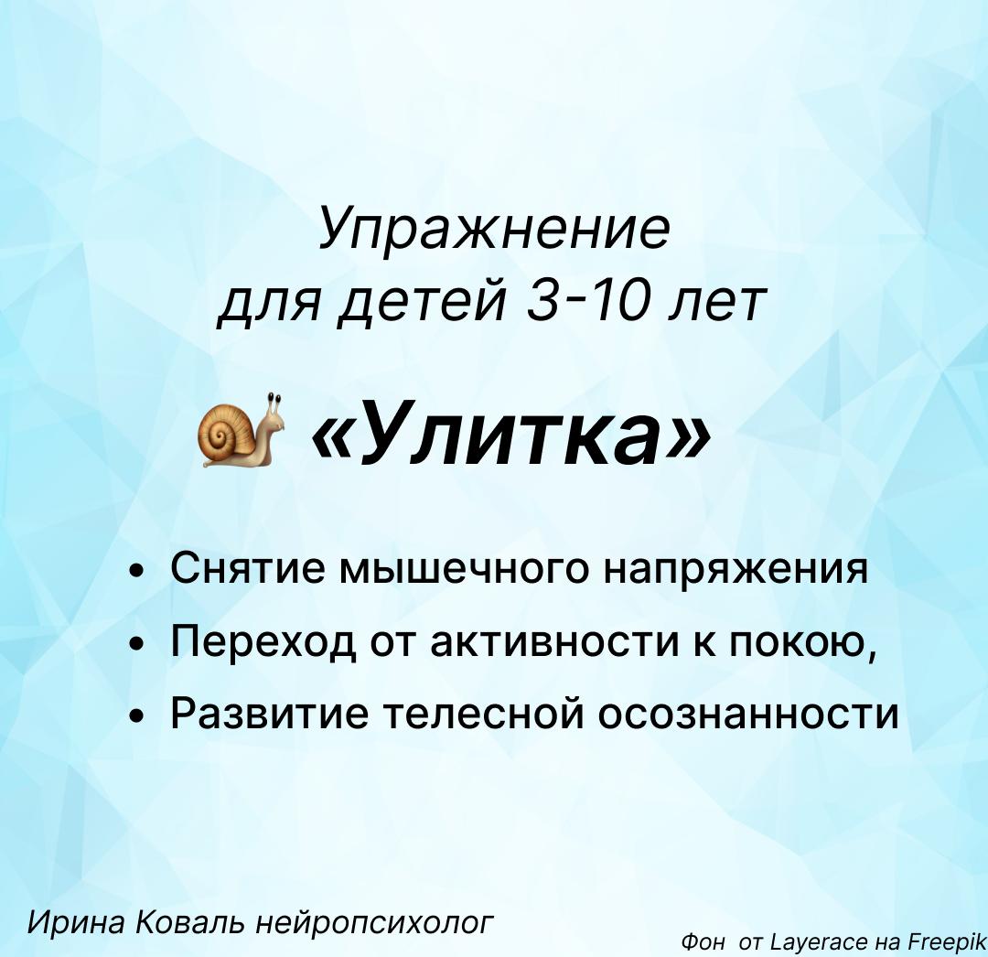 Цель: Снятие мышечного напряжения, переход от активности к покою, развитие телесной осознанности - ощущение «тяжести-лёгкости», активация первого блока мозга через глубокую релаксацию. Время выполнения 5-10 минут. Лучше всего после активных игр или перед сном. Предложите ребенку лечь на коврик или кровать, закрыть глаза и представить себя улиткой или осьминожком, если ребенок боится улиток. Важно говорить медленно, с паузами, тихим голосом. «Представь, что ты - маленькая, уставшая улитка, которая целый день ползала и исследовала мир. Твои рожки и твое тело устали. Сначала улитка хочет проверить, всё ли спокойно. Медленно вытяни «рожки» - руки над головой... Потянись... (пауза 5-7 секунд). А теперь убери рожки - положи руки вдоль тела. Расслабь шею и руки. Пусть они станут тяжёлыми, как камушки. Вспомни, как улитка ползла на своей ножке. Напряги правую ногу, вытяни носочек, будто толкаешься... (напряжение 5 сек). А теперь отпусти ножку, пусть она отдохнёт, станет тяжёлой и тёплой, упадё