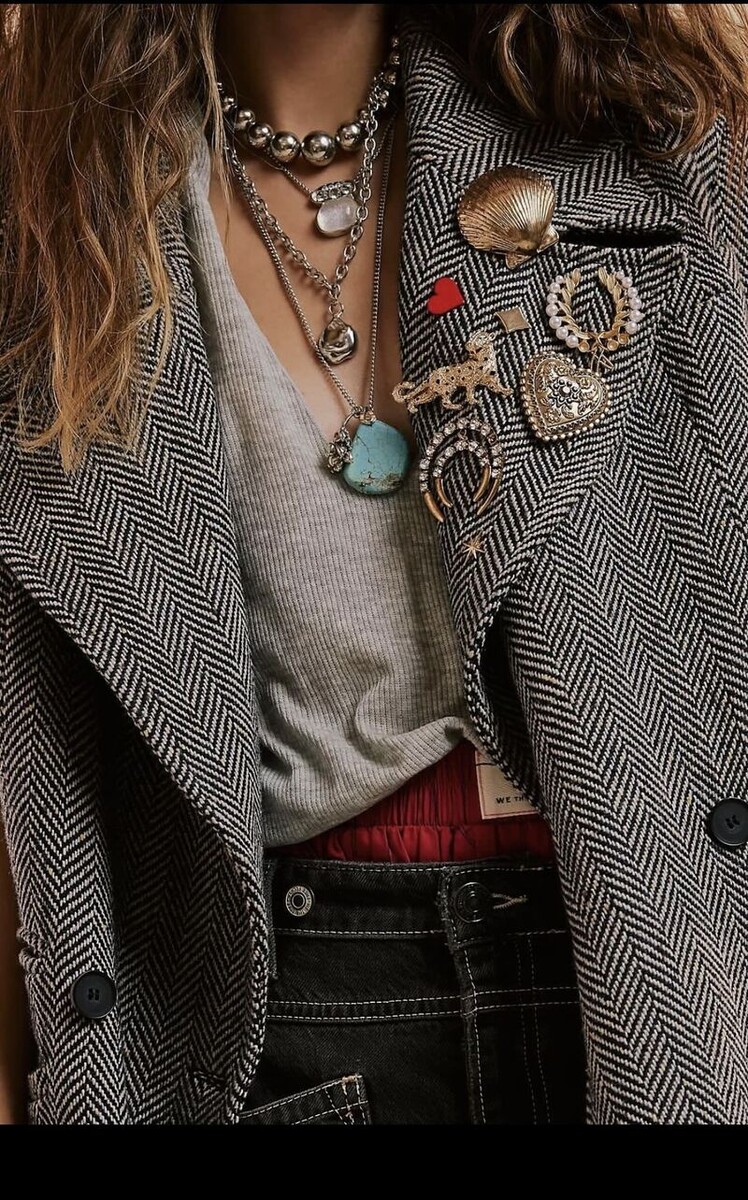 Броши возвращаются не как декоративная деталь, а как центр образа. Их больше не прячут и используют, как полноценный акцент, который задает характер всему комплекту. Особенно актуальны крупные модели с выраженной фактурой. Скульптурные формы, абстракции, металлические цветы, природные мотивы — все это выглядит самобытно и очень стильно. Часто такие броши имеют эффект ручной обработки, неровные линии, объемные детали, что делает их визуально сложными и интересными. Меняется и способ ношения. Брошь больше не привязана к лацкану: ее крепят на воротники, пояса, сумки, используют как элемент драпировки.